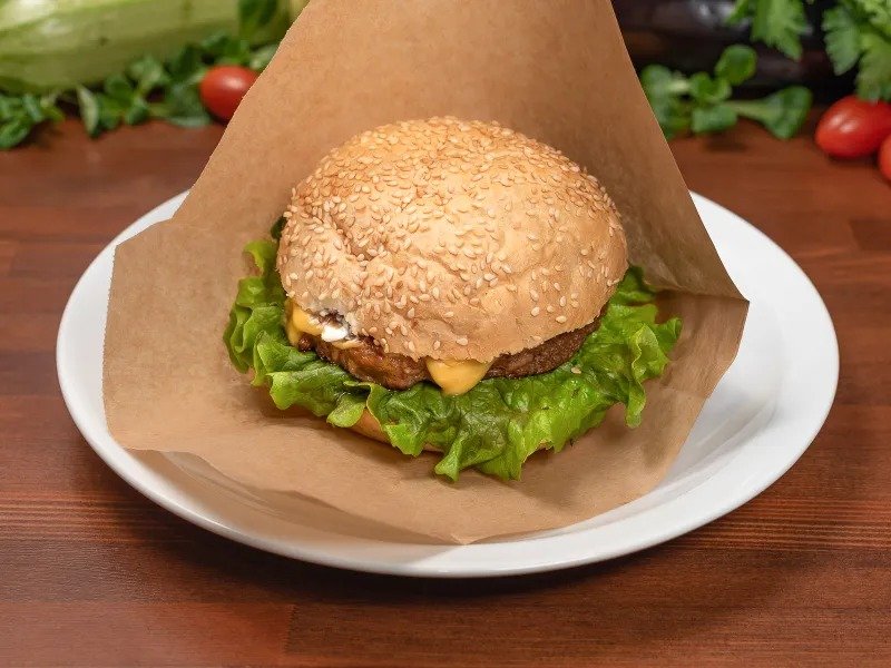 Булка с кунжутом, котлета, помидоры, огурцы, салат, сыр, фирменный соус, 300 гр.