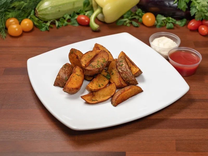Картофель по-домашнему по деревенскому рецепту. 250г, подается с красным соусом