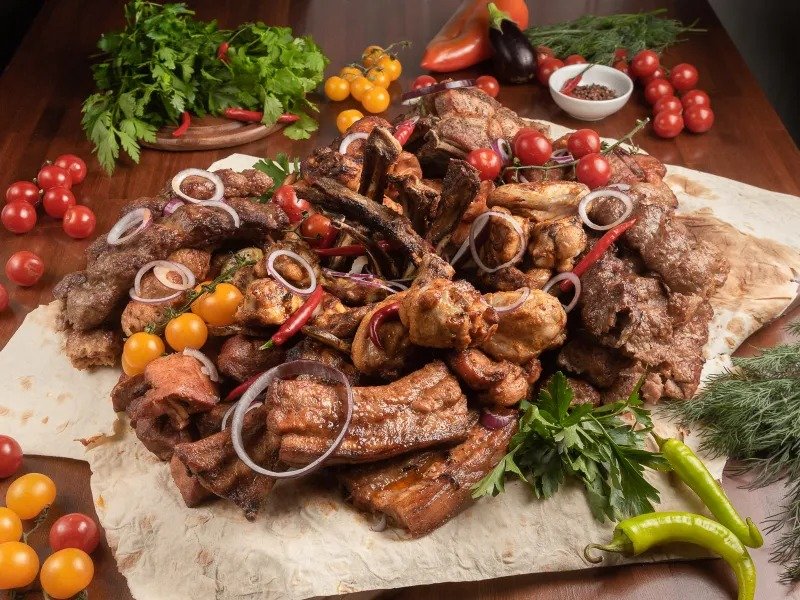 Шашлык из баранины, люля-кебаб из баранины, люля-кебаб из свинины, люля-кебаб из курицы, шашлык из свинины, шашлык чалагач ( антрекот ), свиные ребра, шашлык из курицы, шашлык куриные крылья, шашлык куриная голень, овощи, подается с фирменными соу