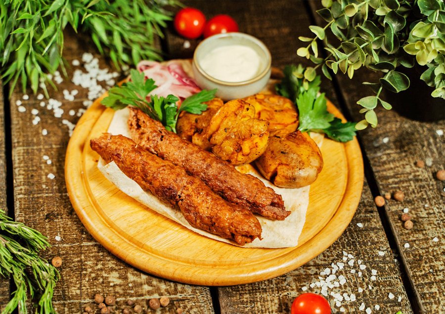 Фарш из курицы со специями, обжаренный на древесном угле. Подается с красным соусом, картошкой, лавашем и маринованным луком.