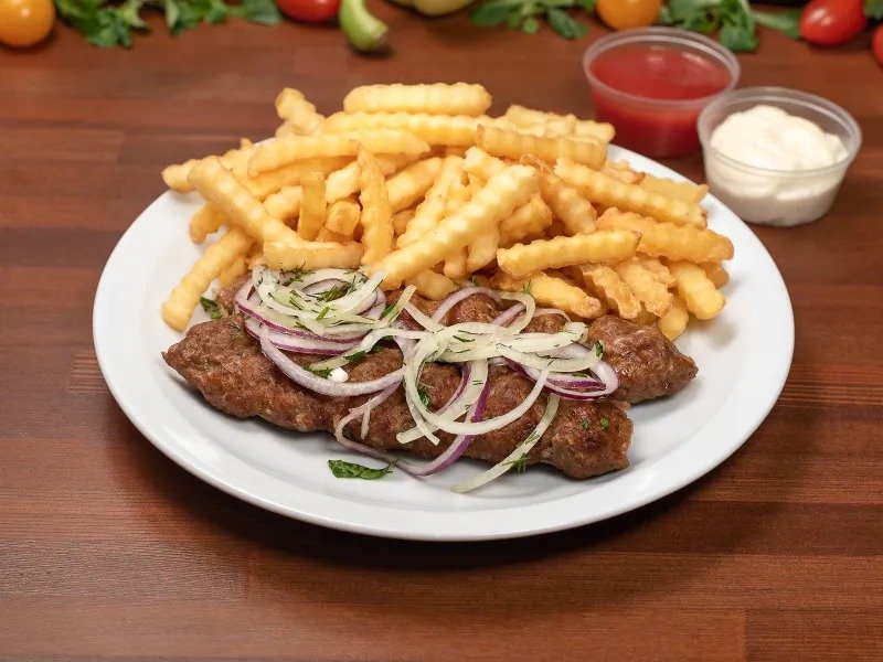 Фарш из свинины (шейный карбонад) со специями обжарен на древесном угле. Подается с красным соусом, картофелем, лавашом и маринованным луком.