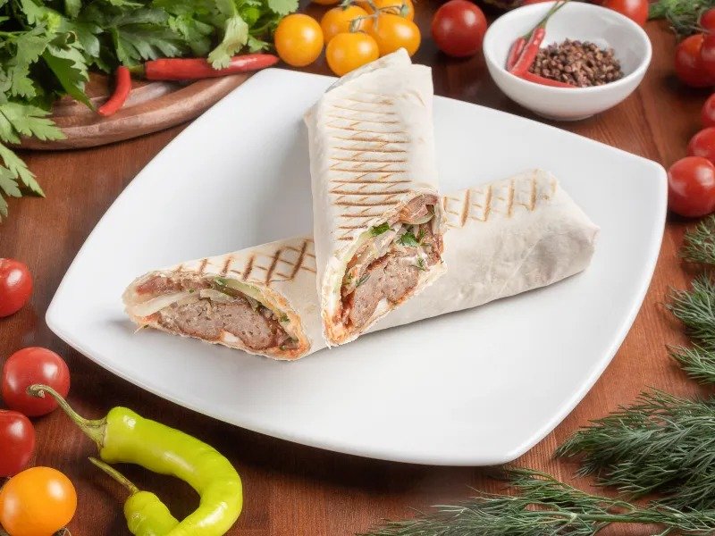 Фарш из курицы (бедро без кости) со специями, обжарен на древесном угле. Подаётся в тонком лаваше с овощами и фирменным соусом, 550 гр.