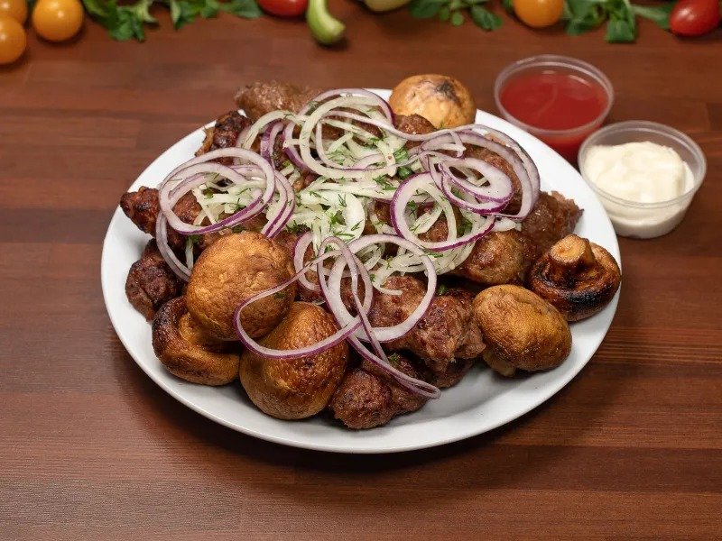 Кебабы куриный, cвинoй, говяжий и бараний. Подаётся с шампиньонами, приготовленными на углях, 800 гр.