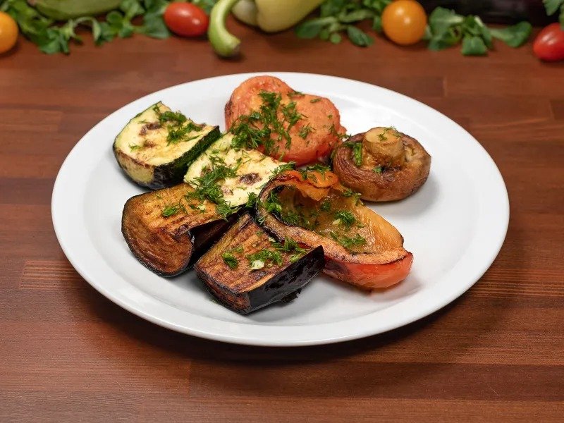 <p>Ароматные овощи на углях, обжаренные по специальному рецепту. Баклажан, кабачок, шампиньон, перец, помидор. Подается с белым соусом</p>