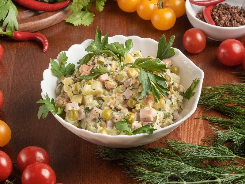 Картофель вареный, морковка, яйца сваренные вкрутую, колбаса вареная Докторская, огурцы маринованные, горошек зеленый, консервированный, майонез, листья петрушки, соль, свежемолотый черный перец. 200г