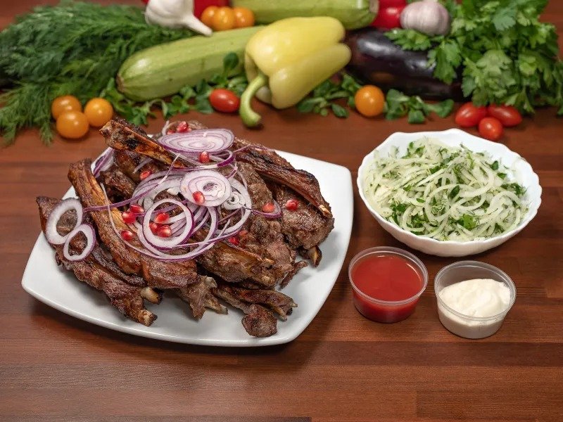 Баранья корейка, маринованная со специями и обжаренная на древесном угле. Подается с фирменным томатным соусом, лавашем и маринованным луком (1 кг)