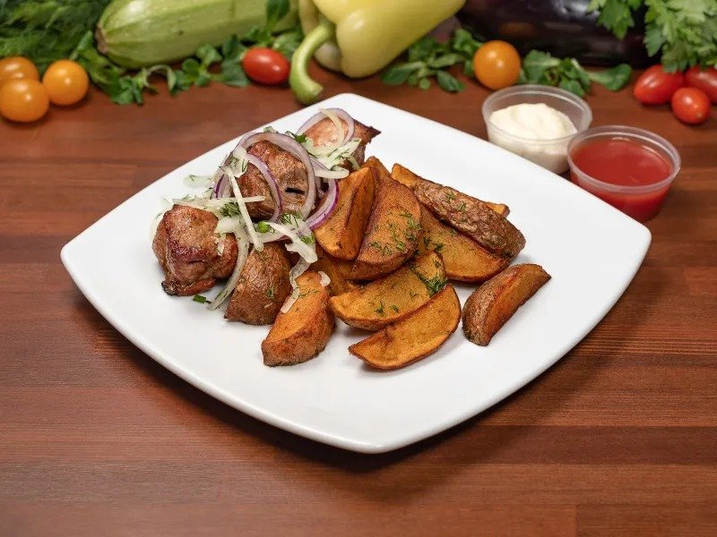 Свинина (шейный карбонад), маринованная со специями и обжаренная на древесном угле. Подается с красным соусом, картофелем по-домашнему, лавашем и маринованным луком, 345 гр.